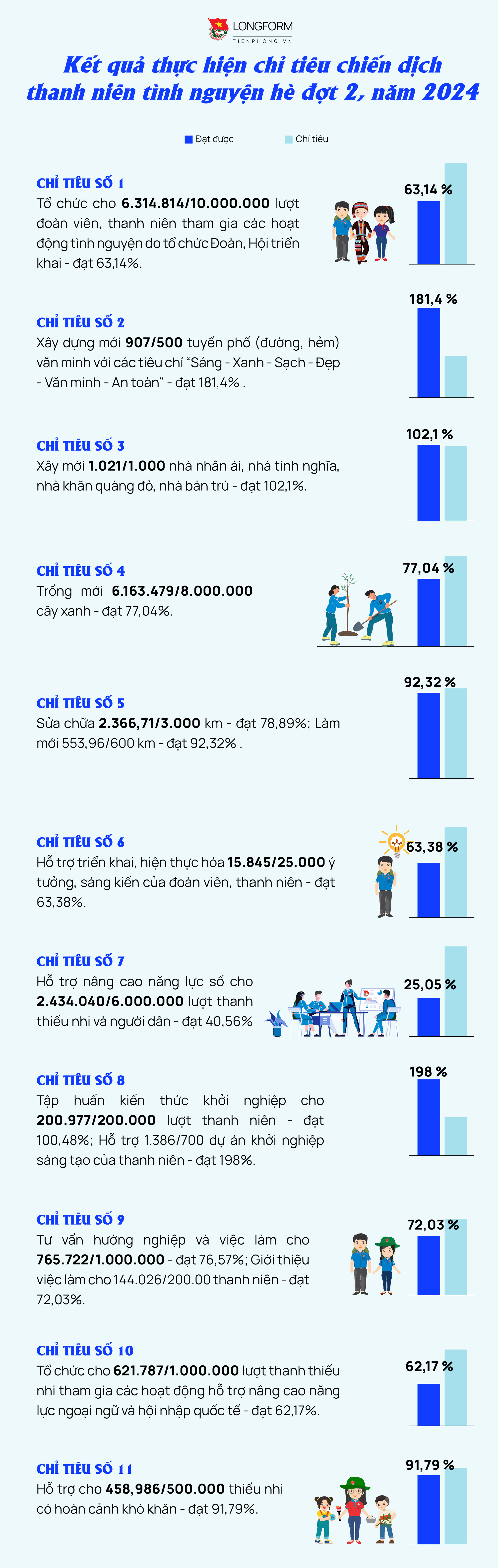Long An: Vừa qua Tỉnh Đoàn Long An đã tổ chức Lễ ra quân Chiến dịch tình nguyện Kỳ nghỉ hồng và Chiến dịch tình nguyện Mùa Hè xanh năm 2024. Đội hình chiến sĩ tình nguyện Mùa hè xanh thực hiện nhiều phần việc như trải đá xanh đường giao thông nông thôn, thực hiện công trình thắp sáng đường quê, tổ chức sinh hoạt hè cho thiếu nhi, thăm gia đình chính sách, Mẹ Việt Nam Anh hùng,… Từ những việc nhỏ như dọn dẹp nhà cửa, trồng cây xanh đến những công trình lớn hơn như làm đường giao thông, vẽ tường, các tình nguyện viên đều hoàn thành một cách tỉ mỉ, chu đáo.