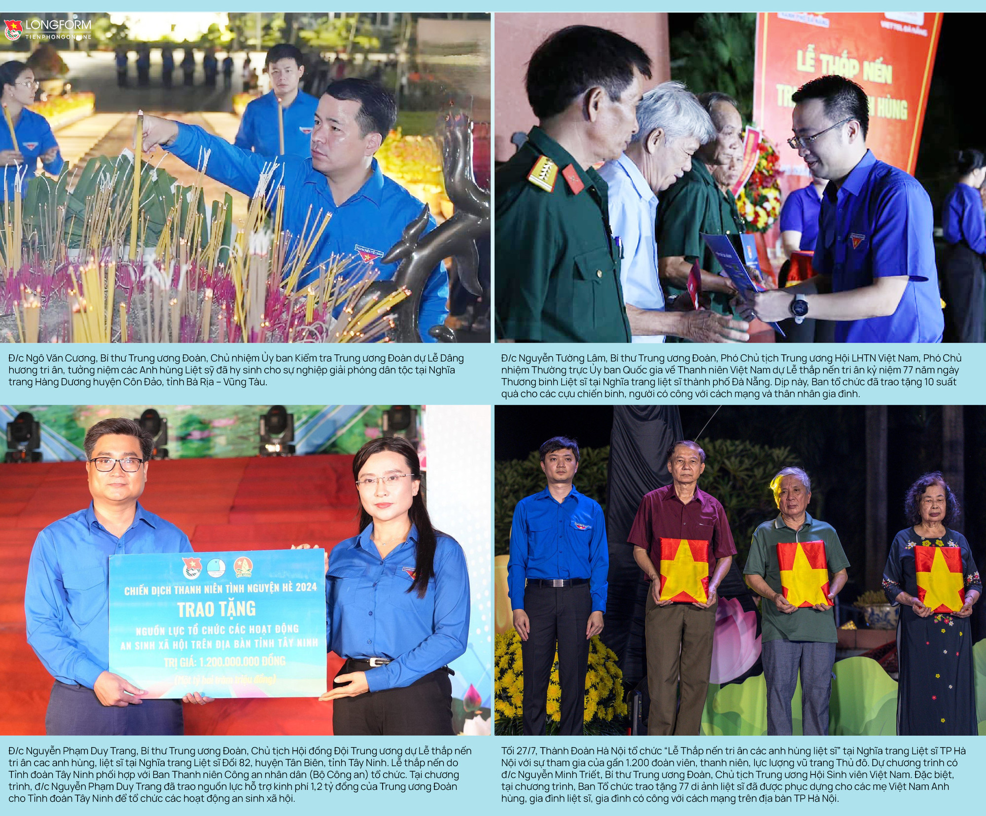 Trong khoảng thời gian cao điểm của tháng 7 - Tháng tri ân, các cấp bộ đoàn và đoàn viên, thanh niên tích cực tham gia các hoạt động thăm, tặng quà gia đình chính sách, thương bệnh binh và các gia đình liệt sĩ; tổ chức “Bữa cơm sum vầy, ấm áp yêu thương” tại gia đình Bà mẹ Việt Nam anh hùng, gia đình người có công với cách mạng và thân nhân của người có công với cách mạng, tham gia Ngày thứ bảy tình nguyện, Ngày Chủ nhật xanh ra quân vệ sinh môi trường, tu sửa, chỉnh trang và làm sạch, đẹp các nghĩa trang liệt sĩ, bia, đài, nhà tưởng niệm liệt sĩ;…