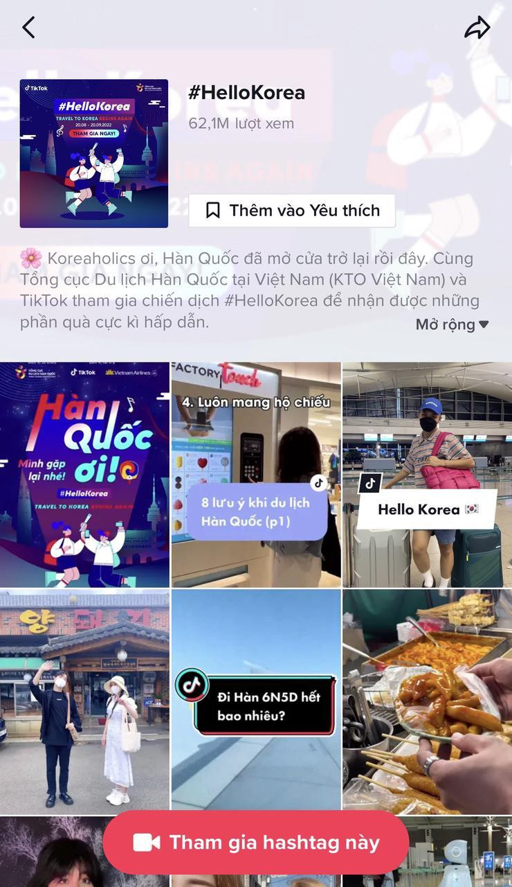 #HelloKorea - hashtag đánh dấu sự trở lại của địa điểm "check-in" du lịch hấp dẫn hàng đầu vào mùa Thu với hội "mê sống ảo" - Hàn Quốc. Hashtag đã thu hút 62 triệu lượt xem và hơn 1,8 nghìn video đăng tải với đa dạng nội dung như: Ẩm thực, văn hóa, du lịch và giải trí... khiến nhiều người muốn "géc gô" ngay lập tức.