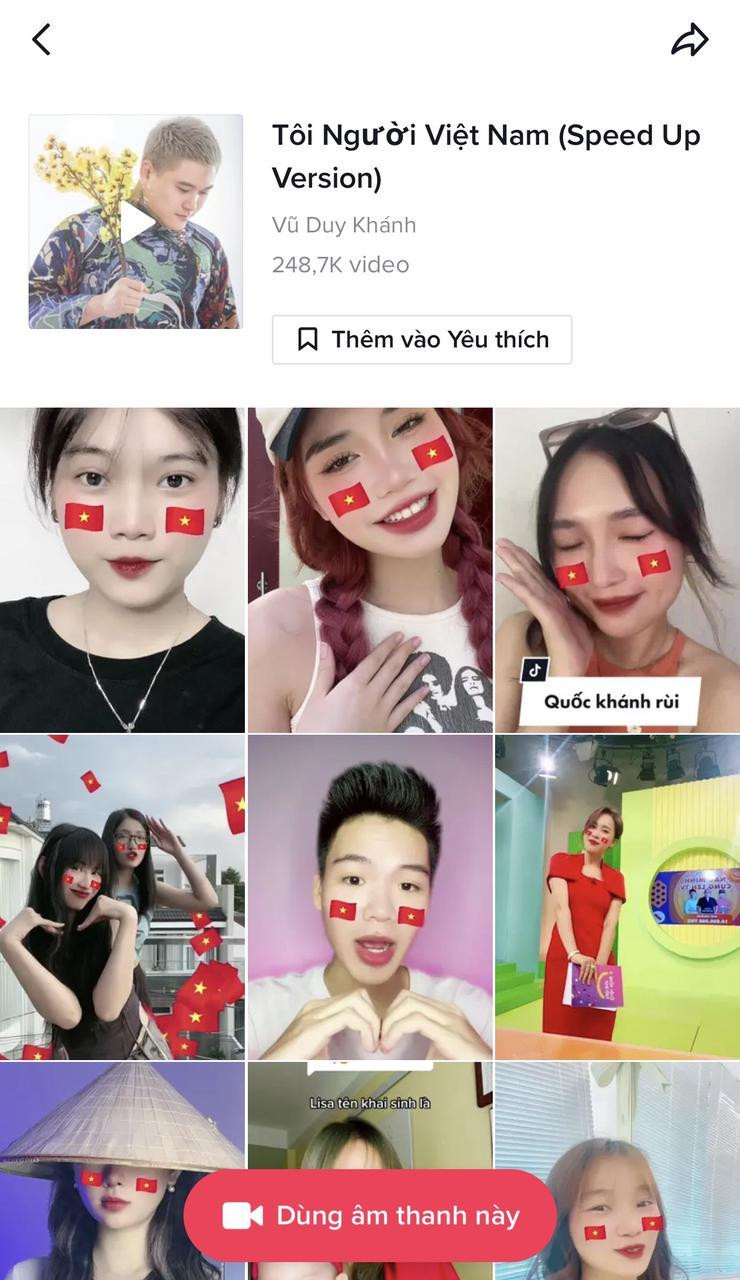 Tôi Người Việt Nam (Speed Up Version) - Vũ Duy Khánh: Hưởng ứng tinh thần ngày 2/9, ca khúc Tôi Người Việt Nam được nhạc sĩ Khắc Việt sáng tác từ năm 2019 một lần nữa viral. Với giai điệu vui tươi truyền tải nỗi niềm của những người con xa quê mang trong mình tình yêu quê hương to lớn, đón nhận hơn 240 nghìn lượt video đăng tải cùng gần 65 triệu lượt xem.