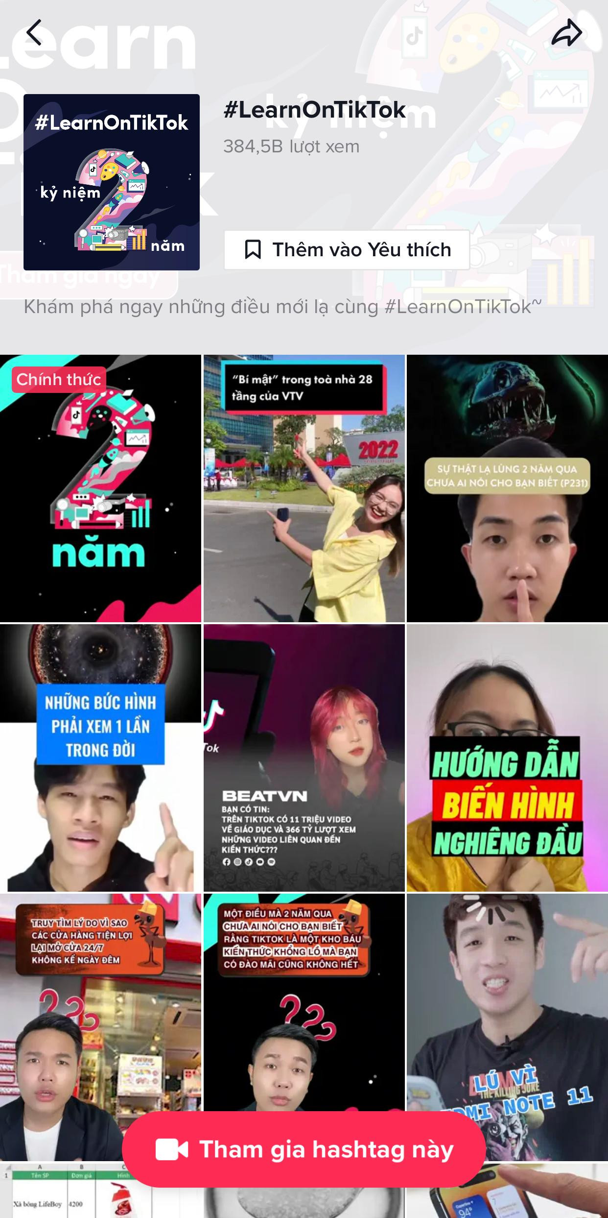 #LearnOnTikTok - Chiến dịch với những chia sẻ hay ho trong suốt hơn 2 năm qua và đạt cột mốc hơn 9,4 triệu video và 329 tỷ lượt xem trong năm thứ hai. Gen Z có thể khám phá “vũ trụ kiến thức” thú vị về cuộc sống xung quanh cùng các gương mặt nhà sáng tạo nổi bật như: Cao Cường Vũ (@caocuongvu, 3,9 triệu lượt theo dõi) - nhà sáng tạo nội dung mảng vũ trụ, khoa học và review đồ dùng hữu dụng; Duy Thẩm (@duythamchannel, 3,9 triệu người theo dõi) - reviewer mảng công nghệ cùng lối làm video vui nhộn; Nam Vlog (@namtrh, 817 nghìn người theo dõi) được biết đến qua các video chia sẻ công thức nấu ăn hấp dẫn…