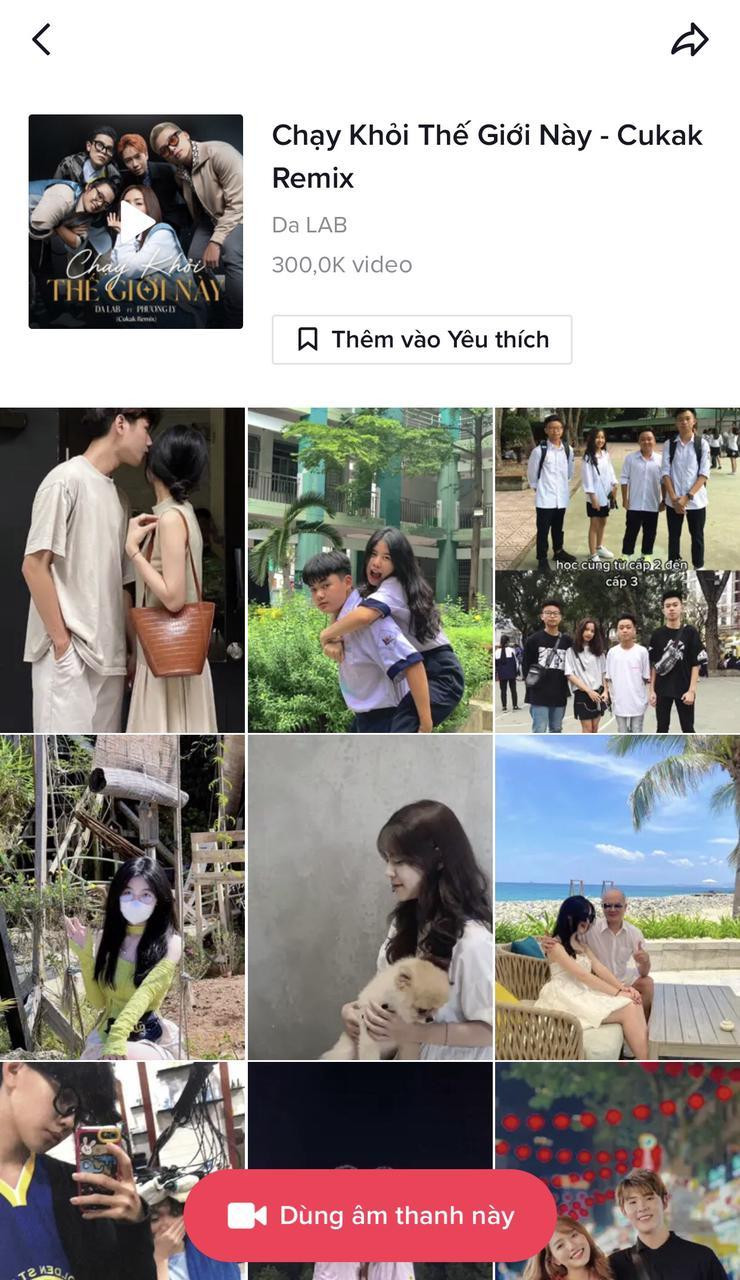 Chạy Khỏi Thế Giới Này - Cukak Remix: Ca khúc đánh dấu lần hợp tác đầu tiên của nhóm nhạc DA LAB cùng nữ ca sĩ xinh đẹp Phương Ly. Bước vào vũ trụ TikTok, bài hát mang một màu sắc hoàn toàn mới, được các TikToker “lăng xê” nhiệt tình với gần 650 triệu lượt xem và hơn 300 nghìn lượt đăng tải, tạo ra một loạt trend thú vị cho những couple.
