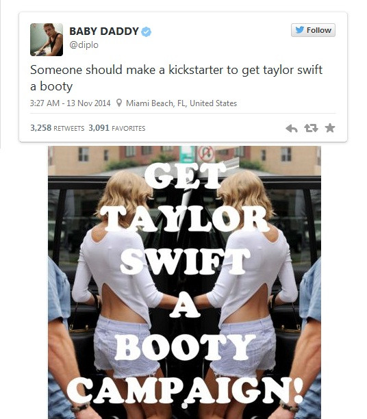 Diplo viết: "Ai đó nên lập ra một chiến dịch để cải thiện vòng ba của Taylor Swift". Dòng status này của nam DJ đã công khai chế giễu ngoại hình của "Công chúa nhạc đồng quê". Taylor Swift được nhiều người biết đến bởi tài năng và gương mặt xinh đẹp nhưng thân hình lại khá gầy gò, kém gợi cảm.