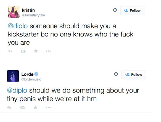 Ngay sau khi hay tin Diplo đả kích Taylor Swift trên mạng, nhiều ngôi sao đã lên tiếng bênh vực giọng ca "Blank Space" trong đó có cô bạn thân - hiện tượng âm nhạc Lorde. Lorde không ngần ngại mỉa mai lại Diplo rằng: "Và chúng ta cũng nên làm gì đó để cải thiện "của quý" bé nhỏ ấy của anh."