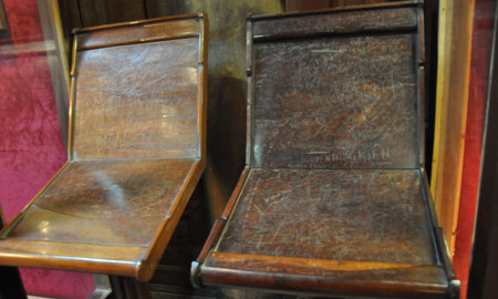 Giá để đồ trong gian thờ Chu Văn An tại Văn Miếu - Quốc Tử Giám chằng chịt tên khắc. (Ảnh: Văn Chung)