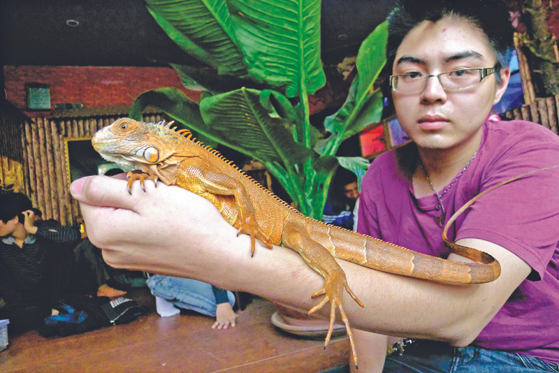 | Ông chủ quán Pet Cafe và chú rồng Nam Mỹ vàng. |