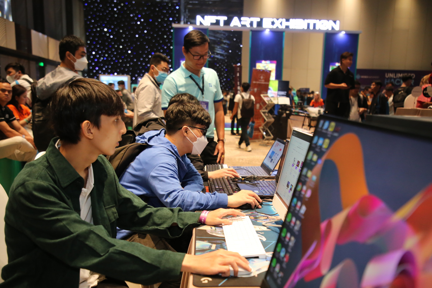 Bạn trẻ trải nghiệm không gian triển lãm các công nghệ high-tech, NFT, game... tại sự kiện.