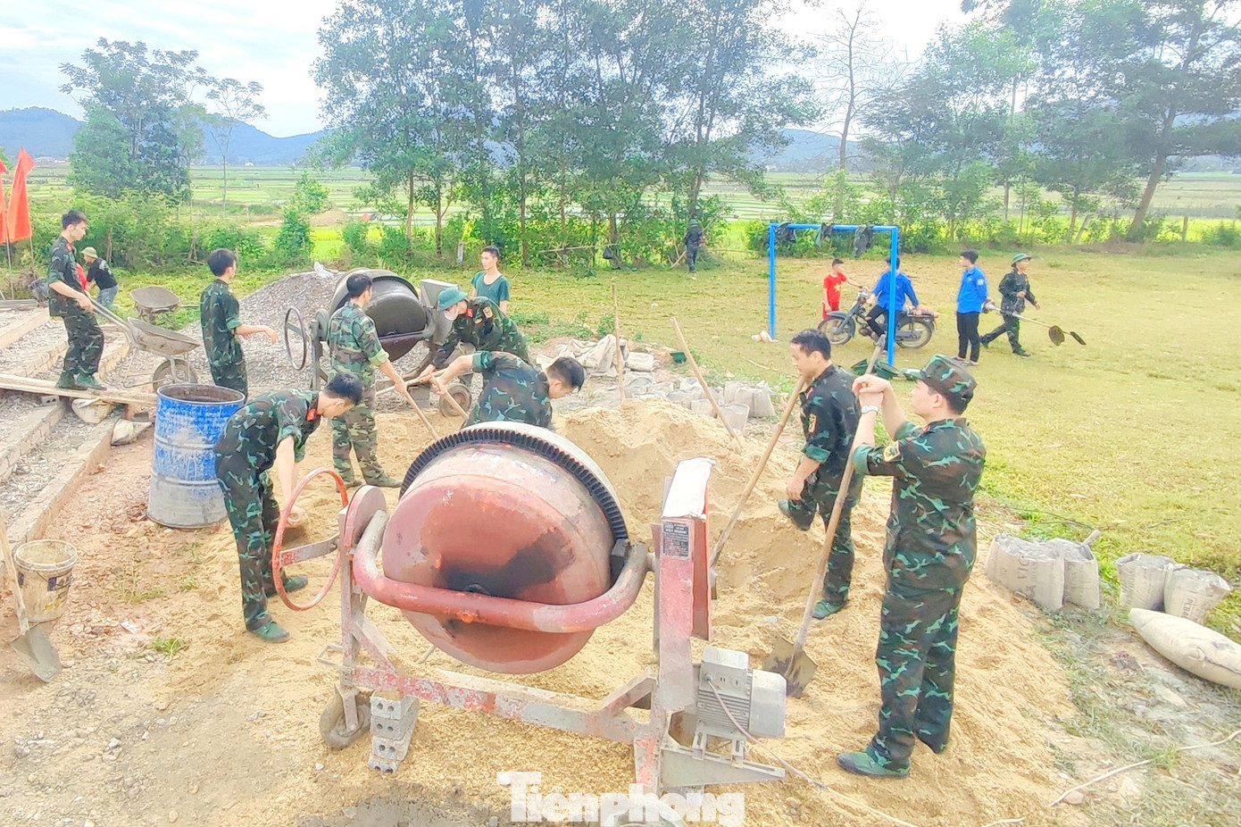 TPO - Dù nắng nóng gay gắt nhưng hơn 100 đoàn viên, thanh niên Thị đoàn Thái Hòa, lực lượng Xưởng 265 Cục Quân khí, Tổng cục kỹ thuật vẫn miệt mài, hăng say đổ bê tông làm sân khấu nhà văn hóa xóm 5 và san nền sân vận động xã Nghĩa Thuận, thị xã Thái Hòa, Nghệ An.