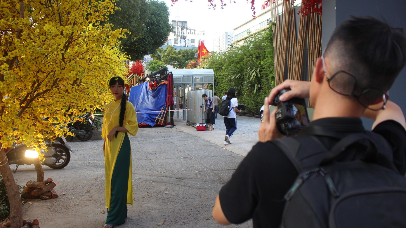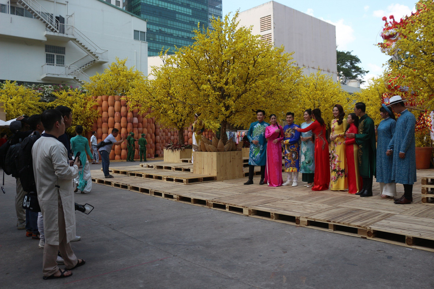 Không gian nghệ thuật sắp đặt sắc màu ngày Tết được dựng bên ngoài khuôn viên Nhà Văn hóa Thanh niên với những gốc mai bao phủ mặt tiền đường Phạm Ngọc Thạch trong một bố cục đẹp mắt, hài hòa cùng các gian hàng "Phố Ông đồ".
