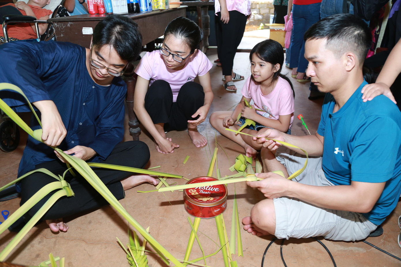 | Các em học sinh cùng phụ huynh tìm hiểu cách làm sản phẩm nghệ thuật từ lá dừa tại ngày hội - Ảnh: Ngô Tùng |