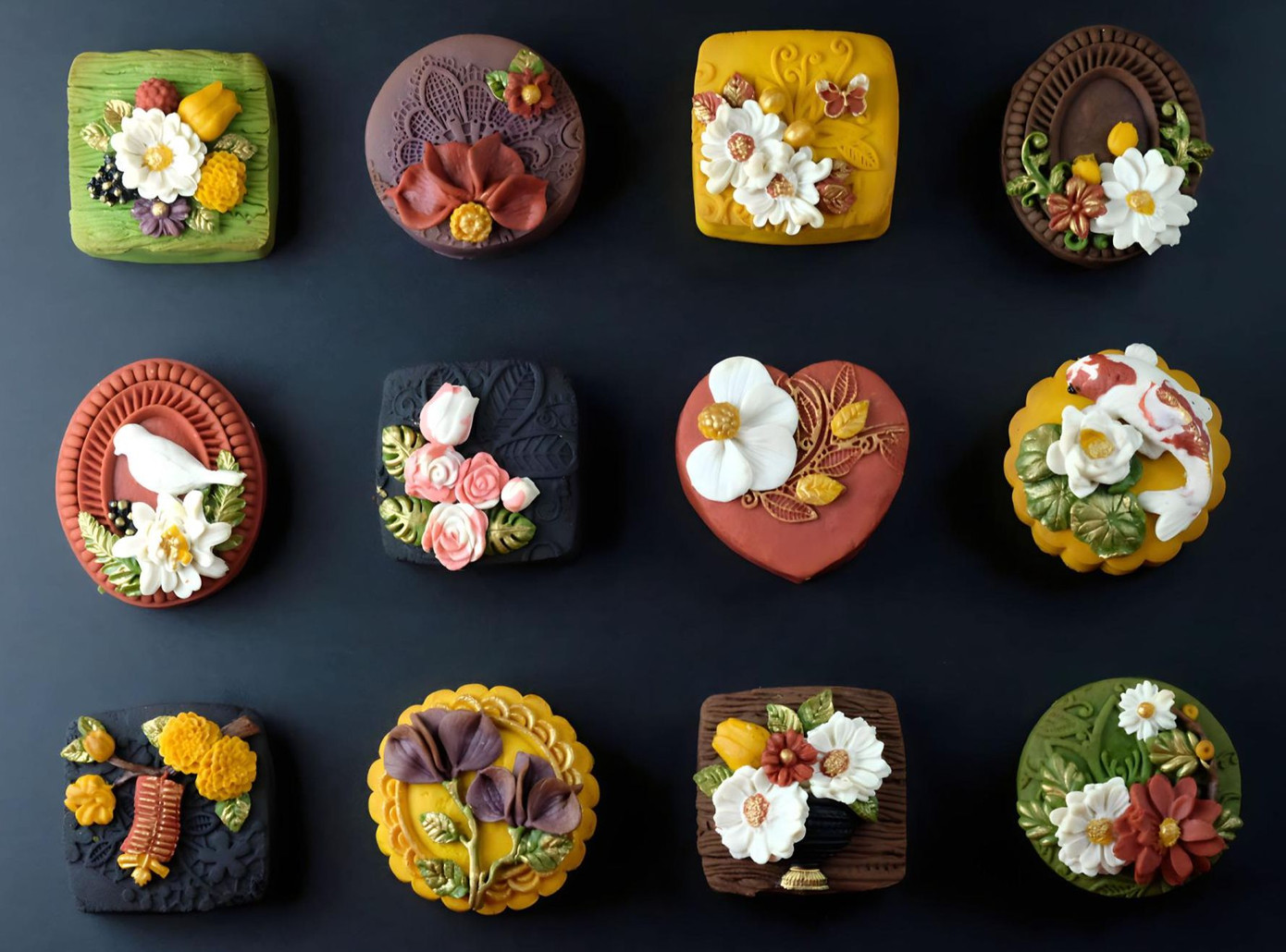 Trên mặt mỗi chiếc bánh như một bức tranh 3D nghệ thuật với các họa tiết hoa nổi độc đáo, khác hoàn toàn so với những chiếc bánh trung thu truyền thống.