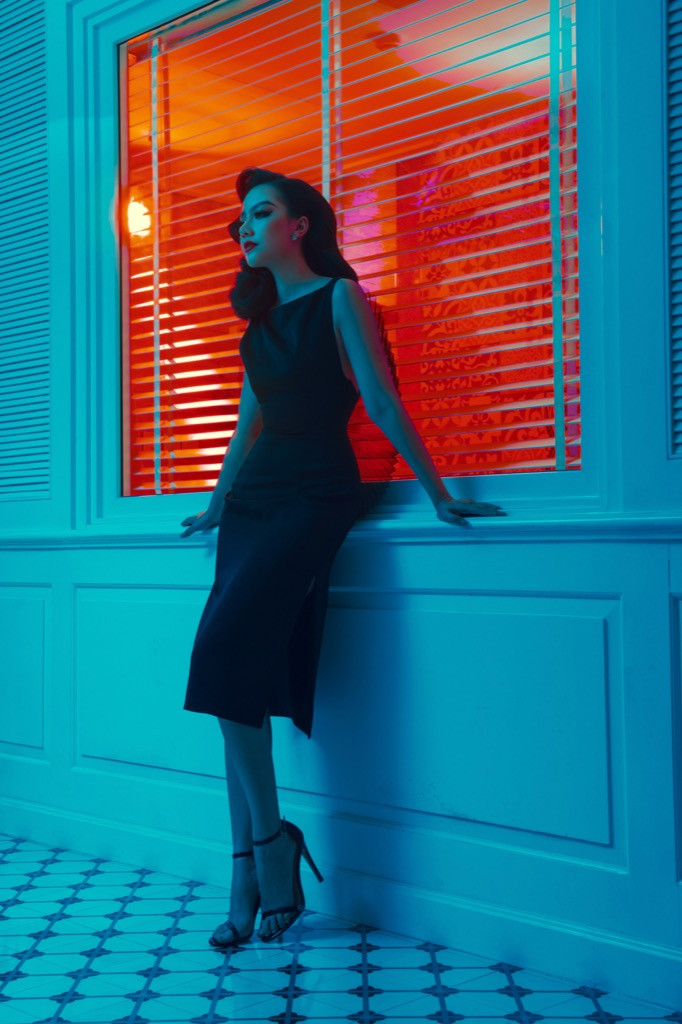 Trong ánh đèn đỏ hiu hắt, Băng Di toát lên vẻ ma mị khi khoác lên mình chiếc đầm đen xẻ lưng. Nữ diễn viên chủ động lựa chọn mẫu thiết kế khoe được lợi thế lưng ong thon thả của mình. Những gam màu đen, ánh kim trên chất liệu ren, satin… mang đến vẻ thời thượng và thu hút cho người mặc.