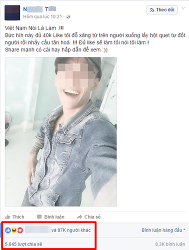 Trước đó, một anh chàng 9X có tên facebook N.T (quê gốc Sóc Trăng) đã đăng ảnh của mình kèm dòng trạng thái: “Bức hình này đủ 40.000 like tôi đổ xăng từ trên người xuống, lấy hột quẹt tự đốt người rồi nhảy cầu Tân Hoá. Share mạnh để có cái hay hấp dẫn mà xem”.