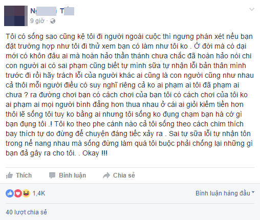 Sau khi lượng like đã vượt mức yêu cầu mà không thực hiện lời hứa, N.T bị một số cư dân mạng chỉ trích, kích bác. Chính vì vậy, nam thanh niên này đã viết một đoạn dài nhằm giải thích cho những phát ngôn của mình. dòng trạng thái chia sẻ trên trang cá nhân với nội dung thanh minh về phát ngôn bừa bãi của mình. “Tôi có sống sao cũng kệ tôi đi, người ngoài cuộc thì ngưng phán xét. Nếu bạn đặt trường hợp như tôi đi thử xem bạn có làm như tôi không? Ở đời mà có dại mới có khôn, đâu ai mà hoàn hảo, thần thánh chưa chắc đã hoàn hảo nói chi con người. Ai có sai phạm cũng biết tự mình sửa, tự nhận lỗi bản thân mình trước đi rồi hãy trách lỗi của người khác..."- N.T viết.