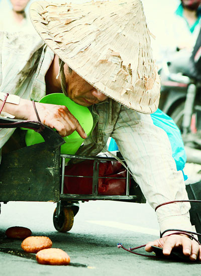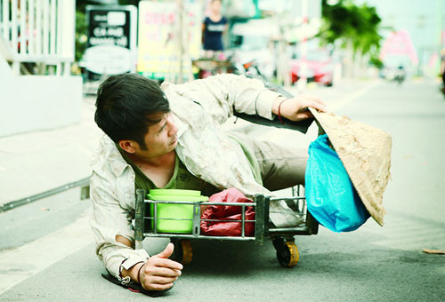 Dưới cái nắng gay gắt, nam ca sĩ không ngần ngại bò lết từng chút một để hóa thân thành người ăn xin