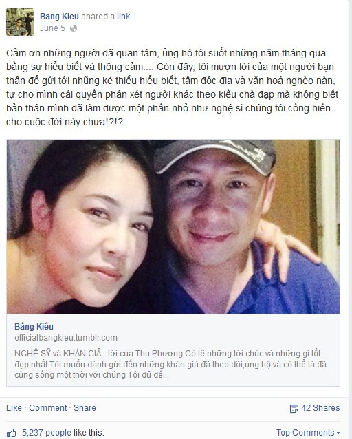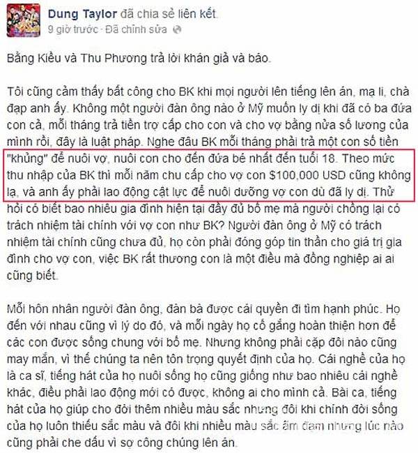 Mới đây, ông xã ca sĩ Thu Phương, Dũng Taylor, đã lên tiếng bênh vực người bạn thân của mình trên trang cá nhân. Theo Dũng Taylor, Bằng Kiều là một ông bố có trách nhiệm và hết mực yêu thương các con. Việc anh bị dư luận lên án là điều quá bất công. Chồng ca sĩ Thu Phương nói rõ Bằng Kiều chu cấp cho vợ cũ và ba con trai một số tiền lớn mỗi năm - khoảng 100.000 USD (hơn 2 tỷ đồng).