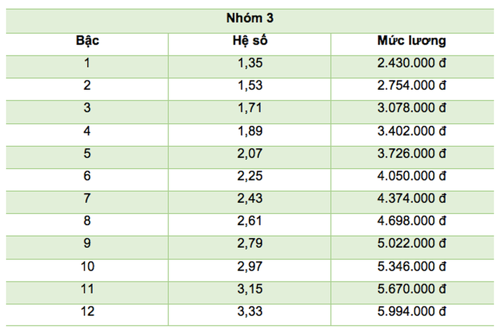 Bên cạnh đó, sẽ có 1 bảng lương chuyên môn, nghiệp vụ theo ngạch công chức và chức danh nghề nghiệp viên chức áp dụng chung đối với công chức, viên chức không giữ chức danh lãnh đạo; mỗi ngạch công chức, chức danh nghề nghiệp viên chức có nhiều bậc lương.