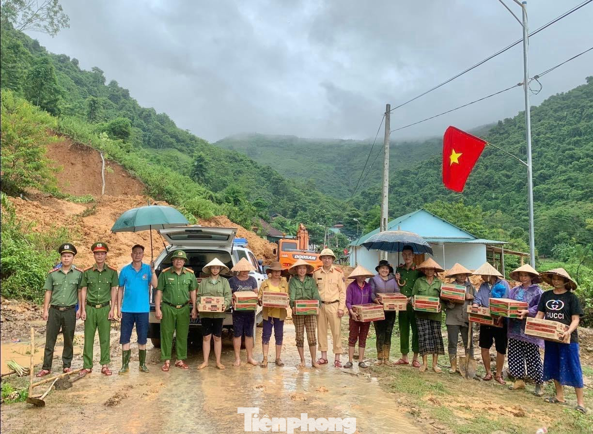 | Kề vai sát cánh cùng người dân vùng cô lập, Công an huyện Kỳ Sơn đã vượt núi, băng dòng nước lũ mang 500 thùng mì tôm, 1,5 tạ cá tiếp sức người dân 3 xã Bảo Nam, Bảo Thắng, Chiêu Lưu - là những địa bàn mưa lớn gây thiệt hại nặng nề nhất. |