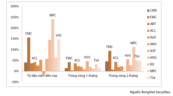 Cổ phiếu HVG của công ty CP Hùng Vương là cổ phiếu thủy sản tăng giá mạnh nhất trên thị trường chứng khoán. Kể từ đầu tháng 9 đến nay, cổ phiếu này chỉ có duy nhất 1 phiên giảm giá. Từ ngày lên ngôi của thị trường chứng khoán cùng với việc mất ngưỡng 36 triệu đồng/lượng của giá vàng, cổ phiếu HVG đã có 3 phiên tăng trần liên tiếp.