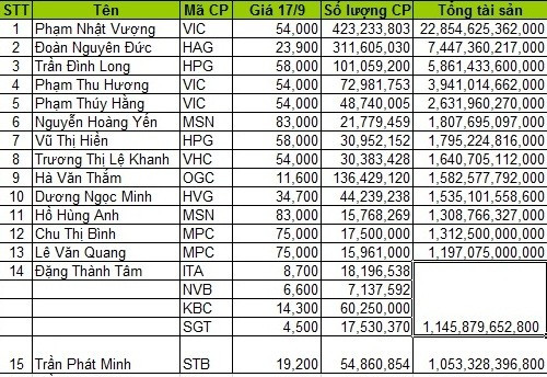 Dưới đây là bảng xếp hạng 15 tỷ phú giàu nhất thị trường chứng khoán Việt Nam theo tổng hợp: