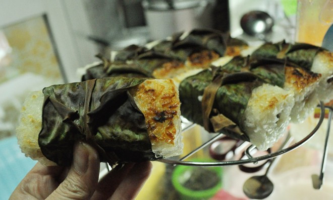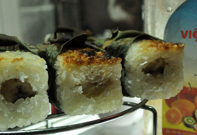 | Chuối bọc xôi nếp nướng bên ngoài giá 5.000 đồng/cái. |
