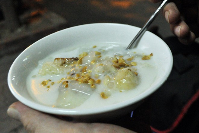 Nhưng ăn bánh căn rồi tráng miệng bằng chè mới chuẩn. Xôi chuối nướng ngọt dẻo thơm quyện trong nước cốt dừa sanh sánh với lạc giã nhỏ, trân châu li ti, món chè ngon, lạ miệng này sẽ cho bạn ấm bụng và “thỏa mãn” hoàn toàn. Bát chè lại chỉ 12.000 đồng – khá rẻ so với nhiều món chè phổ biến của Hà Nội. Thêm một điểm cộng, chè ở đây làm không quá ngọt, chỉ dìu dịu, thanh thanh, rất dễ ăn.