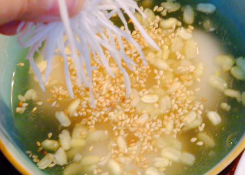 Bước 15: Nước bột sắn sôi, chuyển màu trong và bắt đầu sệt lại, một lúc bạn tắt bếp là xong. Chan nước bột sắn quấy chín vào bát bánh chay đã để sẵn. Sau đó, rắc phần đậu xanh bạn đã đồ chín lên trên. Tiếp đến là rắc vừng rang và thả một chút dừa nạo lên trên cùng là bạn đã hoàn thành bát bánh chay ngon miệng, đẹp mắt.