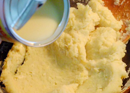 Bước 3: Sau khi đậu nhuyện bạn cho một thìa canh sữa đặc vào đậu để sên cùng. Sữa thấm vào đậu bạn nên nếm lại xem đã vừa vị ngọt hay chưa nếu chưa có thêm sữa tiếp.