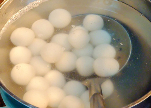 Bước 10: Đun một nồi nước sôi to. Nước sôi thả bánh trôi vào luộc. Để biết bánh chín hay chưa bạn thấy bánh nổi hẳn lên bề mặt nồi tức là bánh đã chín. Dùng muôi thủng để vớt bánh.