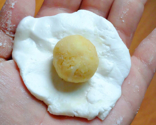 Bước 8: Với bánh chay bạn nặn nhân đậu xanh sữa dừa bằng khổ bánh trôi, sau đó cũng ấn dẹt bột, cho nhân vào giữa và bọc kín lại.
