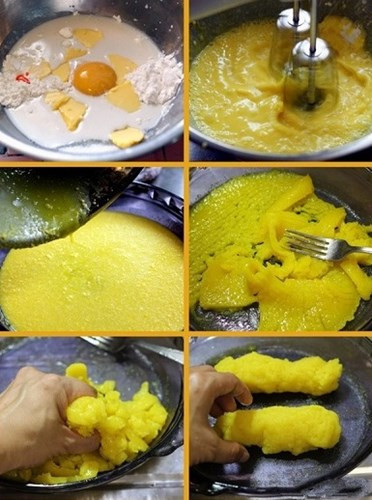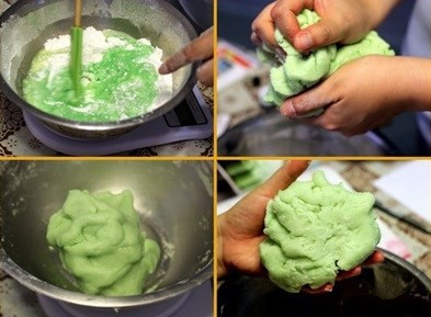 Bước 3: Làm nhân bánh: Bạn phải điều chỉnh lượng đường thấp, cho bớt ngọt. Cho tất cả các nguyên liệu bao gồm bột ngô, bột mì, lòng đỏ trứng, bột sắn, đường, bơ, sữa, và nước cốt dừa cùng màu thực phẩm trộn. Hấp hỗn hợp khoảng 30 phút. Sau khi nhân chín, bạn dùng nĩa hoặc thìa trộn đều cho bột mịn rồi cho ra mặt phẳng, lăn dài và chia thành các miếng nhỏ 35g và vo tròn.