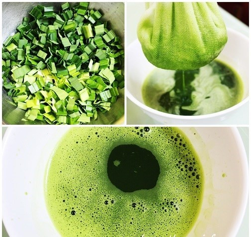 Bước 1: Làm nước cốt dứa: Rửa sạch 8 lá dứa rồi cắt khúc nhỏ ra. Cho lá dứa vào xay nhuyễn rồi đổ thêm 1 lít nước vào. Lọc qua rây rồi cho vào nồi đun sôi. Để nguội rồi đổ vào chai và bảo quản trong tủ lạnh.