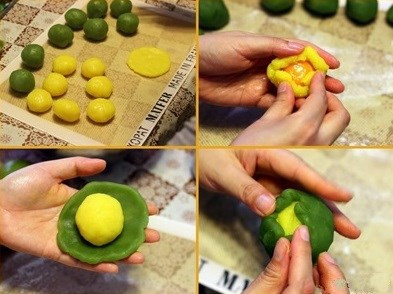 Bước 5: Dùng cân chia đều nhân hạt sen lá dứa thành các khối có trọng lượng khoảng 50g. Sau đó, vo tròn rồi dùng tay ấn dẹt xuống. Phần nhân custard ở trên, bạn cũng làm tương tự bằng cách ấn dẹt xuống. Sau đó, đặt phần nhân custard lên trên phần nhân hạt sen lá dứa, rồi cho một lớp trứng muối vào trong và bọc kín lại.