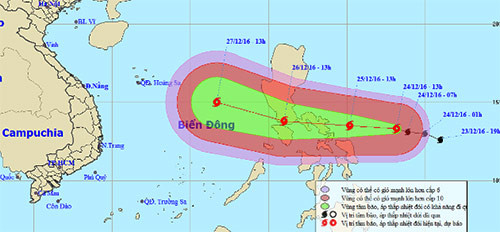 Trung tâm dự báo khí tượng thủy văn Trung ương cho biết, trong 2 ngày tới bão theo hướng tây, tốc độ 15-20 km/h. Đến 13h chiều 26/12, bão ở trên đảo Luzon (Philippines), sức gió mạnh nhất 150 km/h (cấp 13).