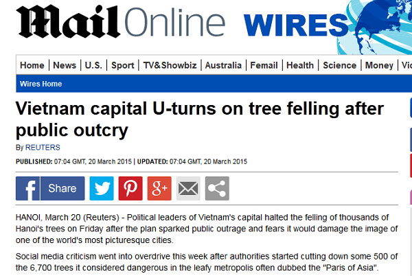 Cụ thể, trang thông tấn Reuters đã đưa tin về kế hoạch này cách đây vài phút, sau đó được trang The Daily Mail dẫn lại với tiêu đề: “Thủ đô Việt Nam đảo ngược kế hoạch chặt đốn cây do phản đối của người dân”.