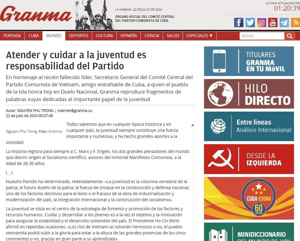Các nhà lãnh đạo Cuba khẳng định, sự ra đi của đồng chí Nguyễn Phú Trọng là “mất mát không thể bù đắp đối với Cuba. Cuba sẽ luôn tưởng nhớ tới đồng chí Nguyễn Phú Trọng như một người anh em vĩ đại, một người thúc đẩy không biết mệt mỏi mối quan hệ hữu nghị đặc biệt giữa hai Đảng, hai Quốc hội, hai Chính phủ và nhân dân hai nước chúng ta”.