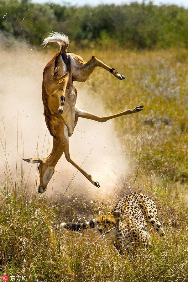 Theo nhiếp ảnh gia Reinhard Radke, để chạy trốn khỏi móng vuốt tử thần của con báo đốm, linh dương đã cực kỳ nỗ lực, làm tất cả những gì có thể, kể cả việc bật người, nhào lộn trên không như phim hành động.
