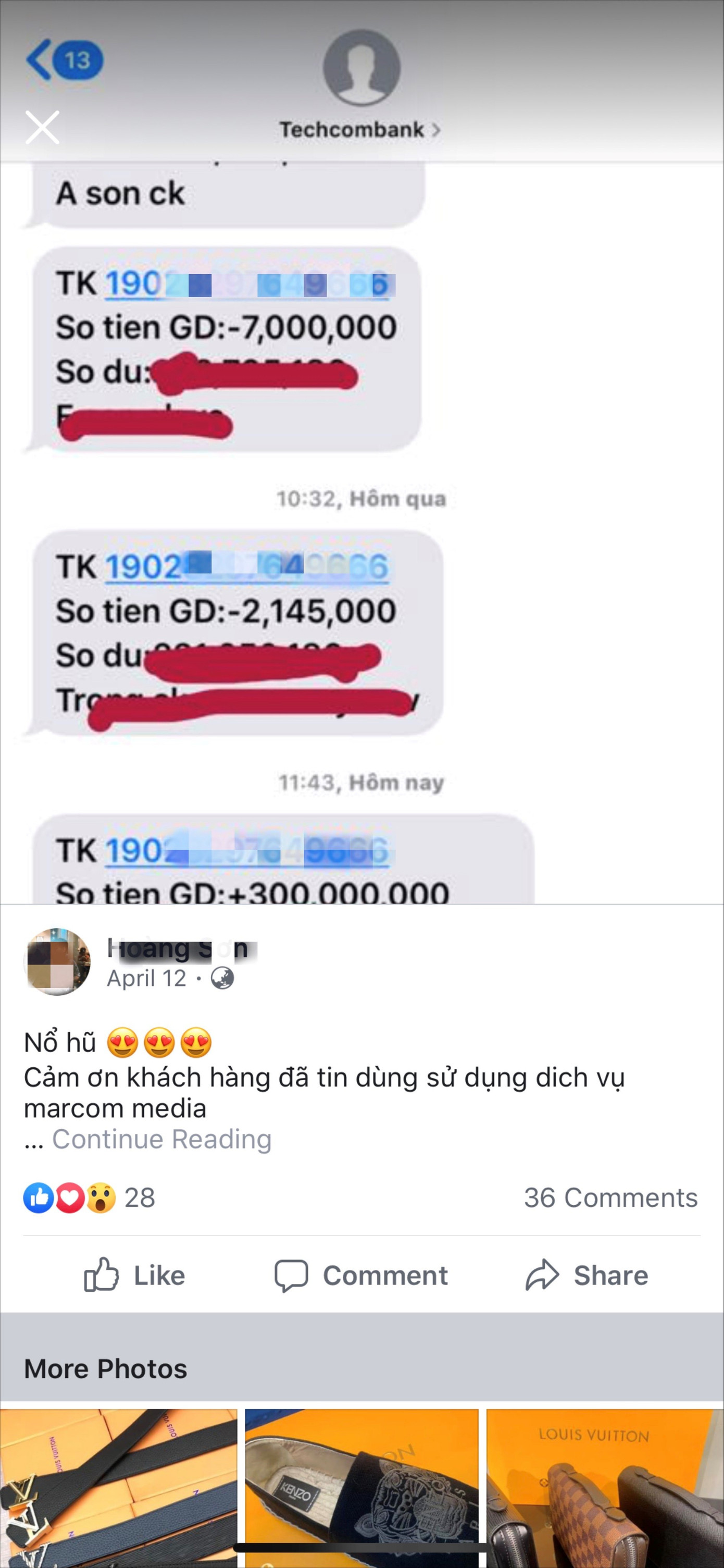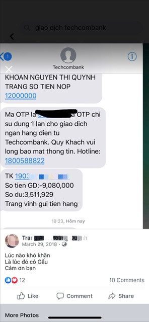 Sự việc được chia sẻ gần đây nhất diễn ra ở tài khoản của một người bán hàng trực tuyến trên mạng xã hội Facebook, thu hút hàng nghìn lượt share, comment. "Đầu tiên vào lúc 15h47 có 1 số lạ 088 8501xxx và 028 71098xxx gọi cho mình tự xưng là nhân viên của T., nó đọc đúng 100% tất cả các giao dịch của mình ngày hôm qua, đọc đúng cả số thẻ của mình luôn. Nó lựa chọn đúng giao dịch nhiều tiền nhất của mình, đọc đúng số tiền mình đã nhận lẫn lời nhắn gửi “ck mua tom 5,2kg”. Và bảo là hiện tại không xác định được người gửi số tiền này, bên nó sẽ gửi 1 mã OTP cho mình, mình hãy cung cấp mã OTP cho nó, nếu không tài khoản sẽ bị phong toả 72h và số tiền 2.652.000 kia sẽ chuyển hoàn vào tài khoản của người gửi cho mình . Mình không chịu cung cấp mã OTP thì đúng là tài khoản ngân hàng của mình đã bị treo mất 10 phút không giao dịch được" - nữ khách hàng kể lại sự việc trên MXH.