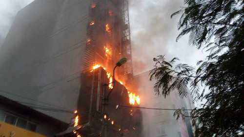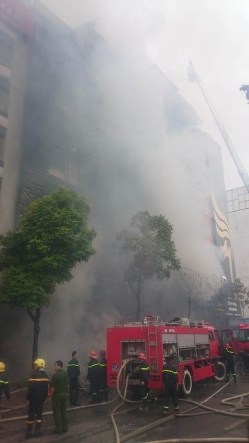 Cụ thể, vào khoảng 18h, lửa xuất phát từ biển quảng cáo trên tầng 2, sau đó lan rộng 8 tầng quán karaoke. Phát hiện cháy, khoảng 20 nhân viên và khách hát tháo chạy ra ngoài. Người dân sống liền kề với quán cũng vội di dời tài sản vì sợ lửa bén vào.