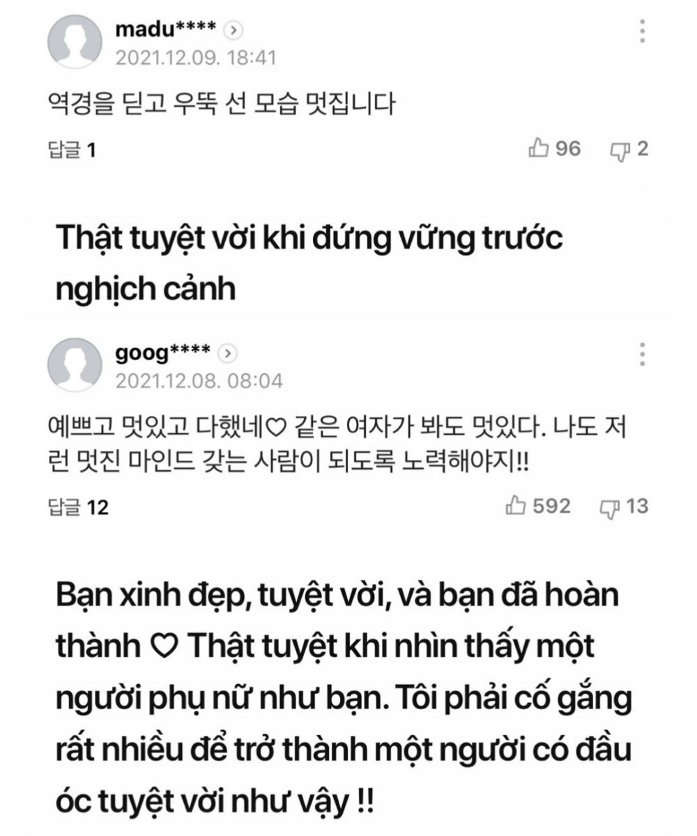 Nhật báo Quốc dân, News1, SBS News và hàng loạt trang báo khác của Hàn Quốc đã liên tục đưa tin thể hiện sự bất ngờ trước bản lĩnh của nhan sắc đến từ Việt Nam. Có rất nhiều lời bình luận “có cánh” dành cho sự kiên cường của Thùy Tiên. Một số dành được nhiều lượt thích như: “Cô ấy đã vượt qua nghịch cảnh như thế thật đáng ngưỡng mộ,” “Khó khăn vậy mà cô ấy vẫn khôn lớn một cách lành mạnh và đứng đắn như này thật tuyệt.”...