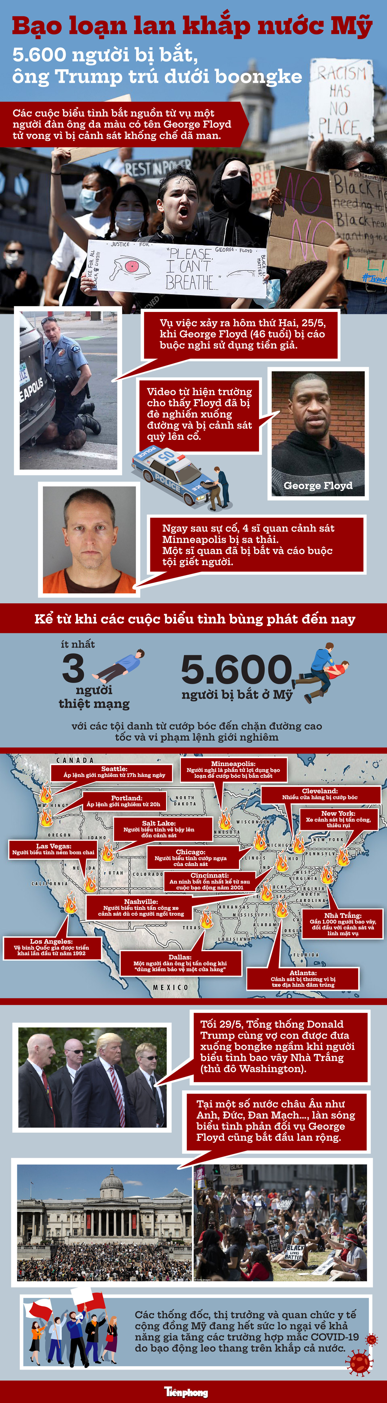 TPO - Kể từ khi các cuộc biểu tình bùng phát đến nay, đã có ít nhất 3 người thiệt mạng và 5.600 người bị bắt ở Mỹ với các tội danh từ cướp bóc đến chặn đường cao tốc và vi phạm lệnh giới nghiêm.