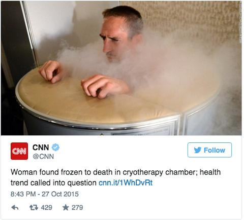 Tối qua, kênh CNN của Mỹ đã cho đăng tải bài viết về một người phụ nữ bị chết ngạt vì sử phương pháp áp lạnh trong bồn thép chuyên để dùng hồi phục thể lực. Thế nhưng, điều đáng nói là họ lại dùng hình ảnh Frank Ribery ngồi trong một chiếc bồn cùng loại để minh họa. Hình ảnh này ngay lập tức khiến nhiều fan hiểu nhầm rằng, tiền vệ người Pháp đã qua đời.