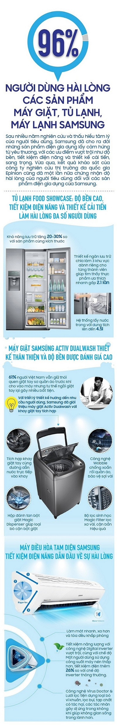 Kết quả khảo sát 96% người dùng hoàn toàn hài lòngđối với sản phẩm điện gia dụng Samsung đã phản ánh những thành quả của quá trình sáng tạo, phát triển công nghệ không ngừng của hãng.