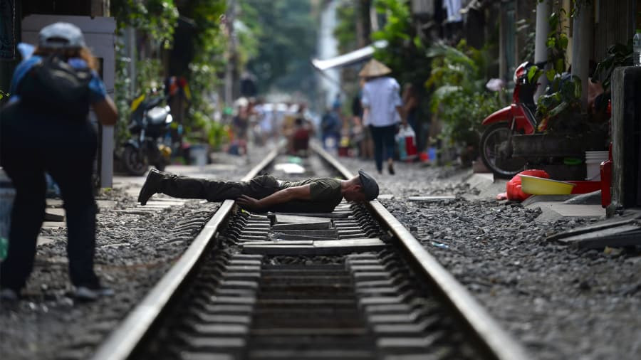 Một trong những bức ảnh lọt top là hình ảnh một gia đình có 2 con nhỏ ngồi bên chiếc bàn đặt giữa đường ray.