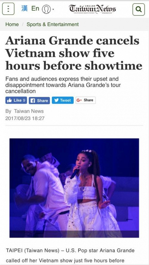 Cuối cùng, Taiwan News bày tỏ hy vọng, khi Ariana Grande đang đến Đài Loan vào ngày 19/9, những điều tương tự sẽ không xảy ra với người hâm mộ Đài Loan.