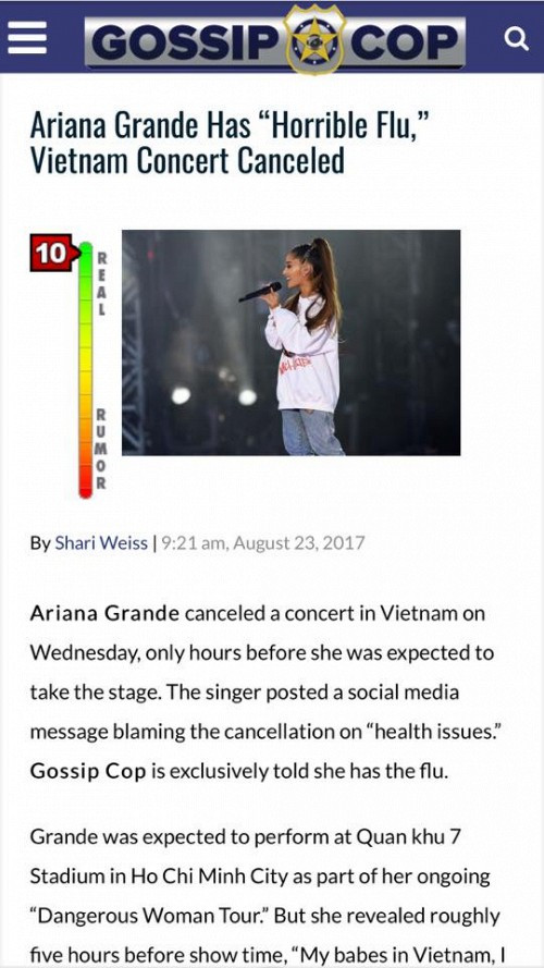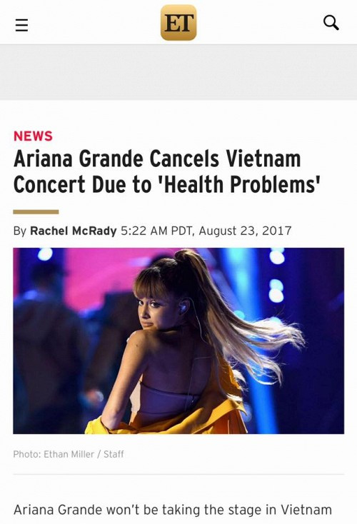 Ngoài Gossip Cop, một số trang báo quốc tế khác như ETonline, 9news, Enews cũng liên tục cập nhật thông tin về việc huỷ tour của Ariana tại Việt Nam.