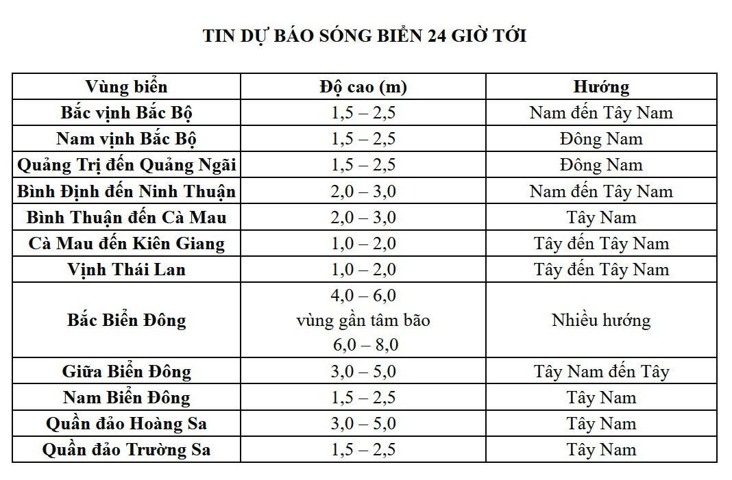 Cảnh báo gió mạnh, sóng lớn trên biển: Do ảnh hưởng của bão, vùng biển phía Đông và phía Bắc khu vực Bắc Biển Đông có mưa bão, gió mạnh cấp 7-8, sau tăng lên cấp 9-10, vùng gần tâm bão cấp 11-12, giật cấp 15; sóng biển cao từ 6,0-8,0m; biển động dữ dội.