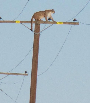 Peter Day, phóng viên tại nhật báo Victor Valley, trông thấy con báo sư tử trưởng thành ngồi vắt vẻo giữa hai tấm biển báo "Điện cao thế" khi đang lái xe qua Lucerne Valley, California hôm 29/9. Những bức ảnh ghi lại tư thế nguy hiểm của con vật do Day chụp lập tức thu hút nhiều sự chú ý.