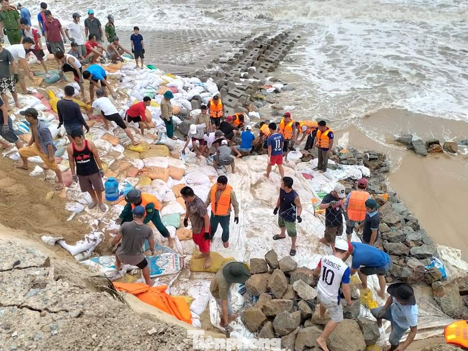 Tại xã Phú Thuận, các lực lượng quân đội, công an, dân sự, chính quyền địa phương đã huy động hơn 1.000 người cùng vật tư dự trữ như rọ đá, đá hộc, vải lọc từ nhiều ngày lại đây liên tục tham gia gia cố, chống sạt lở khẩn cấp cho 2,5km bờ biển.