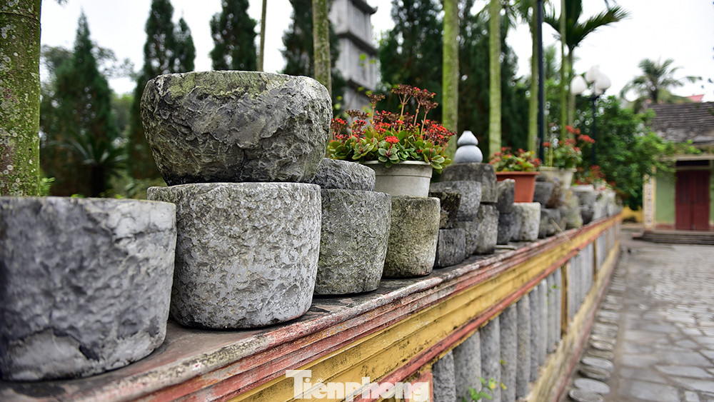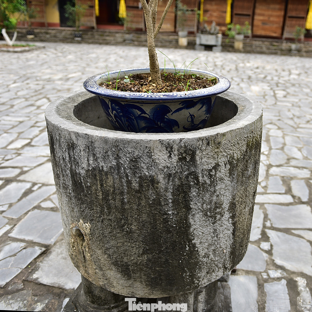 Cối đá trở thành chậu trồng cây cảnh đẹp mắt tại sân chùa Đồng Ngọ.
